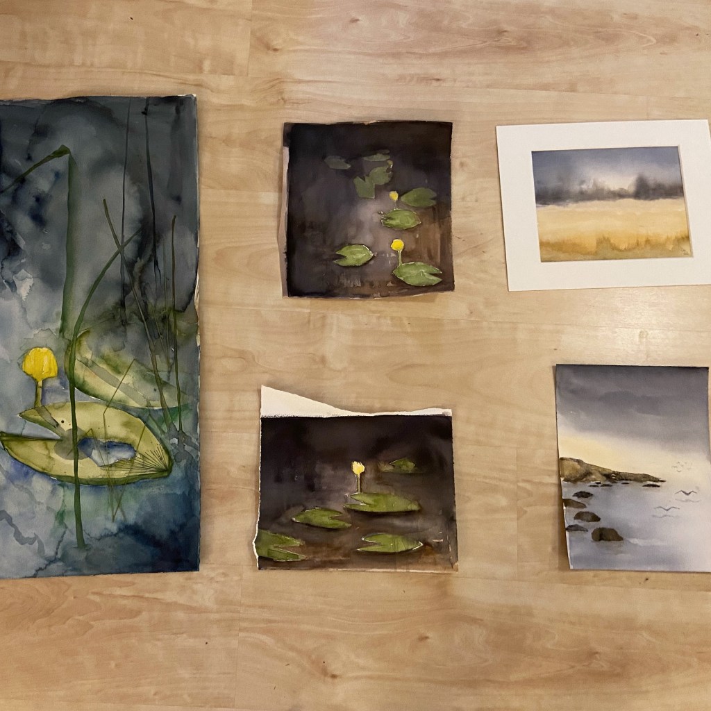 I förra veckan la jag ut de akvareller jag hade hittills på golvet (så brukar jag göra för att få en överblick). Och trodde att jag var nöjd. Några som skulle målas klart bara.