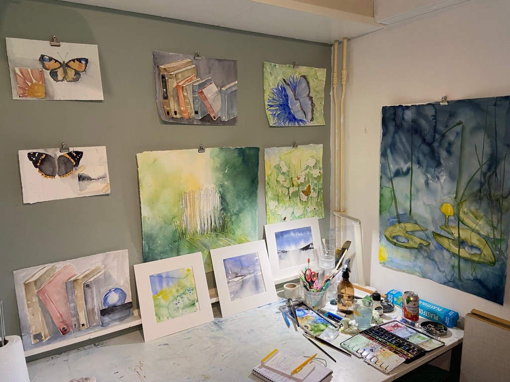 Nu har de mörka näckrosorna fått sällskap av ljusa fjärilsbilder, böcker på sniskan och ännu fler fjärilar. Tror det kan bli bra det här.